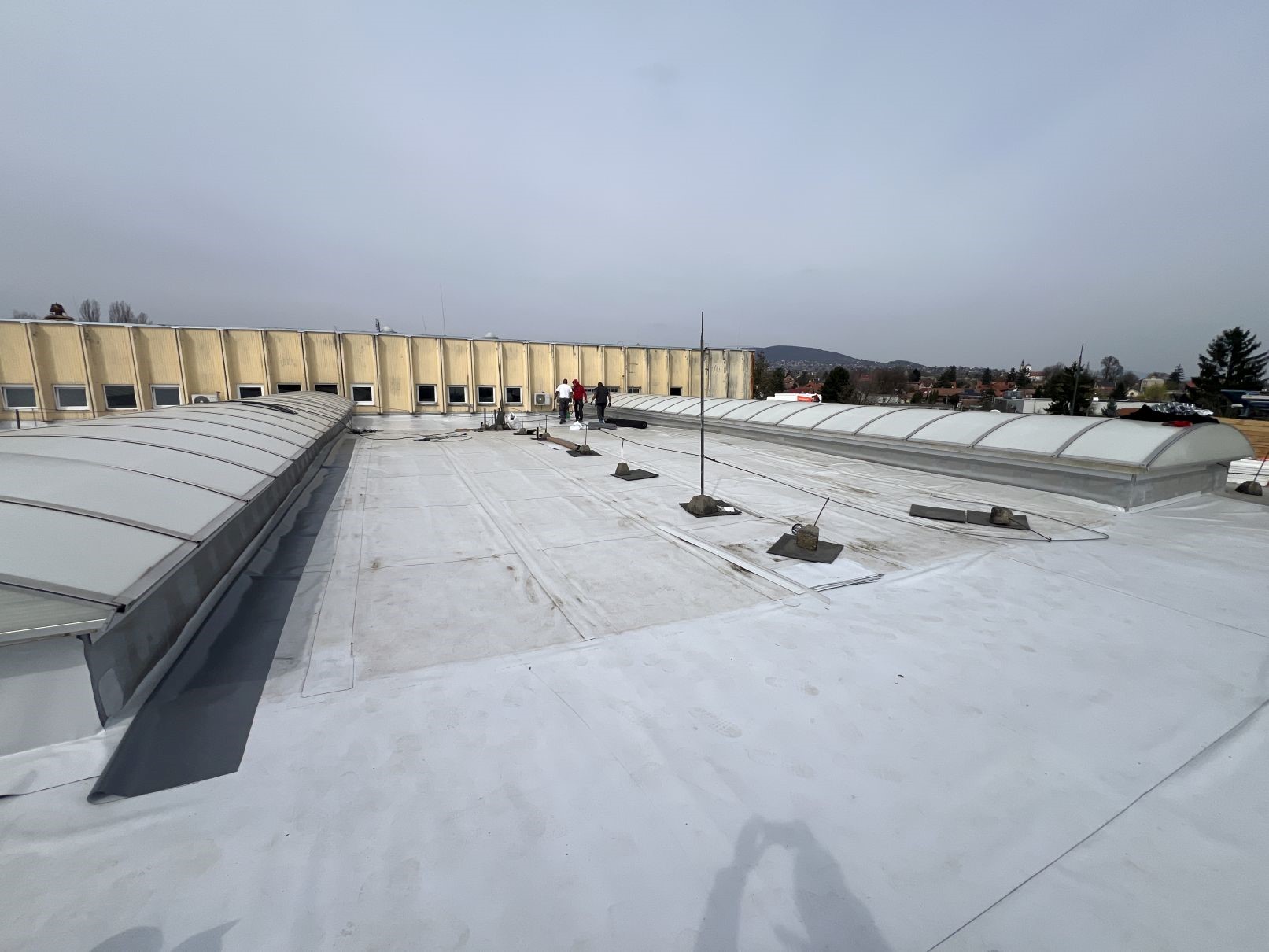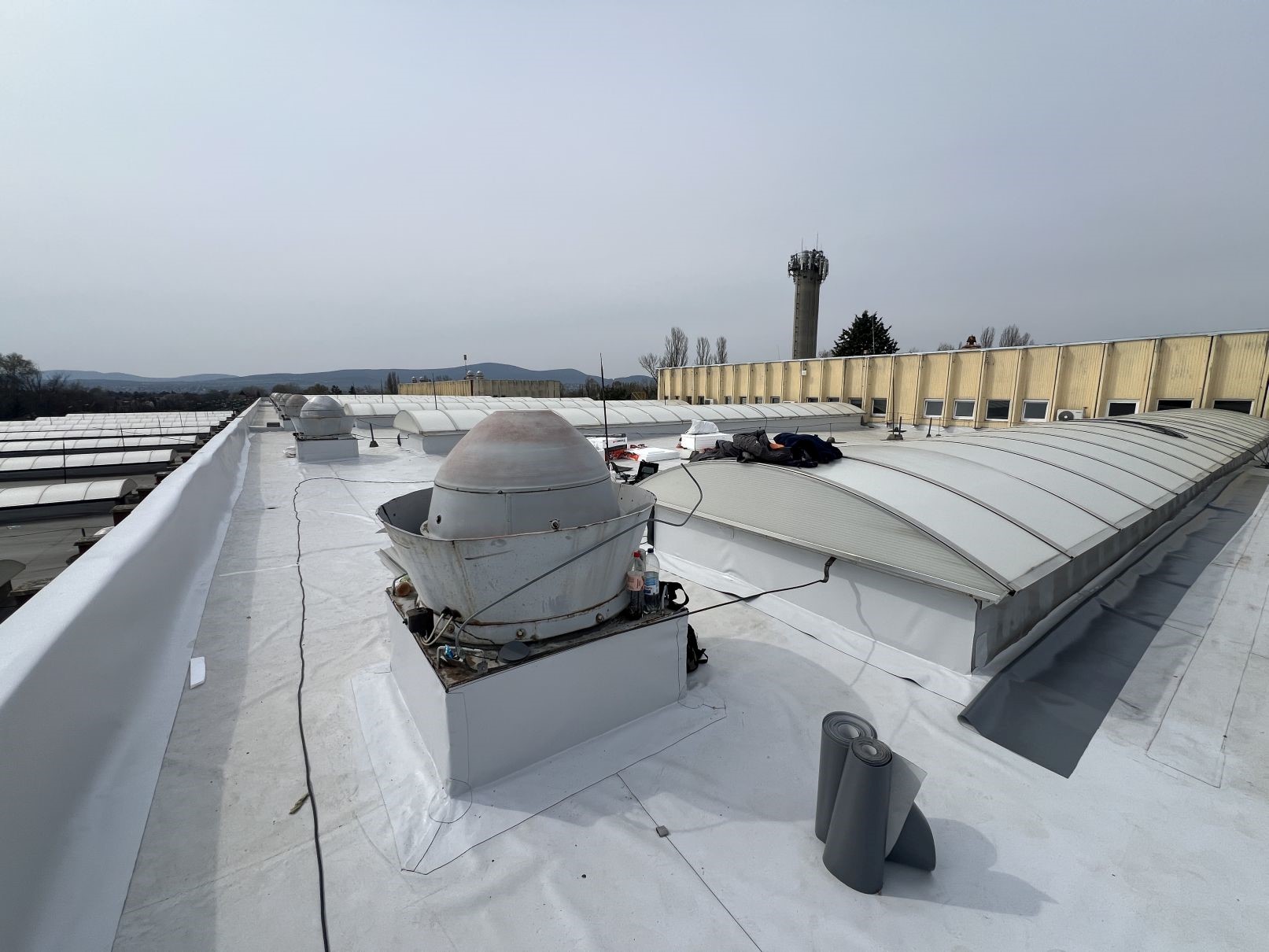 A szentendrei csarnoképület több mint 2500 m² alapterületű lapostetőjének korszerűsítése során átfogó PVC szigetelési és lejtéskorrekciós munkákat végzünk a hosszú távú vízzáróság és üzembiztonság érdekében. A projekt keretében a meglévő rétegrend műszaki felülvizsgálatát követően új, korszerű hő- és vízszigetelő rendszer kerül kialakításra.